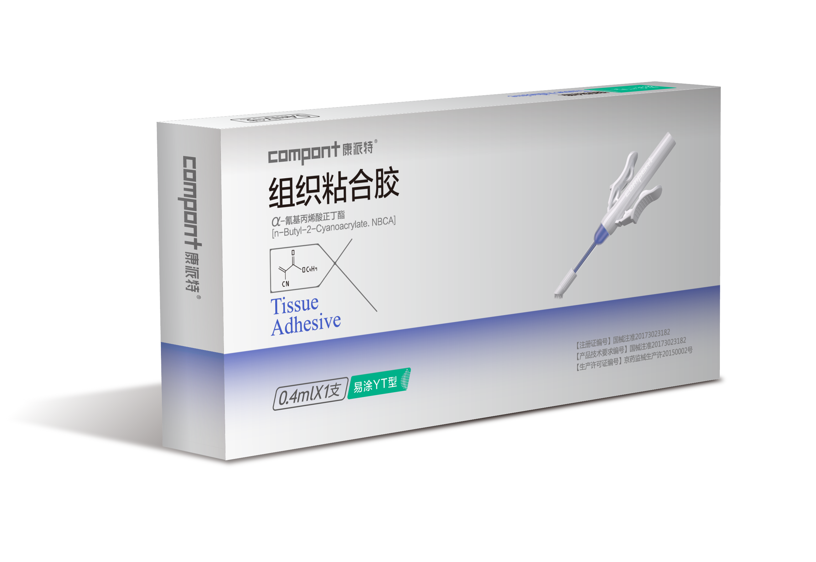 组织粘合胶主要成份为α-氰基丙烯酸正丁酯,添加少量的着色剂紫罗兰2号(1-羟基-4-(对甲苯胺基)-蒽醌),同时配有少量的对苯二酚、对甲苯磺酸以及二氧化硫作为稳定剂;配备有无菌吸管。